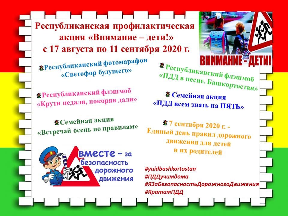 11 сентября завершается профилактическая акция "Внимание дети". В целях обеспечения безопасности на дорогах, пропаганды соблюдения Правил дорожного движения и профилактики детского дорожно-транспортного травматизма в МБДОУ №28 г. Салавата проводились различные мероприятия: беседы и минутки безопасности «Знай правила движения как таблицу умножения», «На дорогах победителей нет!», составление безопасного маршрута «Дом — сад, сад — дом», викторины «Веселый свтофорик», «Внимание, дорога!», видеолекторий «Зебра», выявление велосипедистов, обновление стендов по ПДД в группах и в фойе, трансляция аудиороликов и презентаций. От дисциплины на дороге зависит наша безопасность и безопасность окружающих людей!